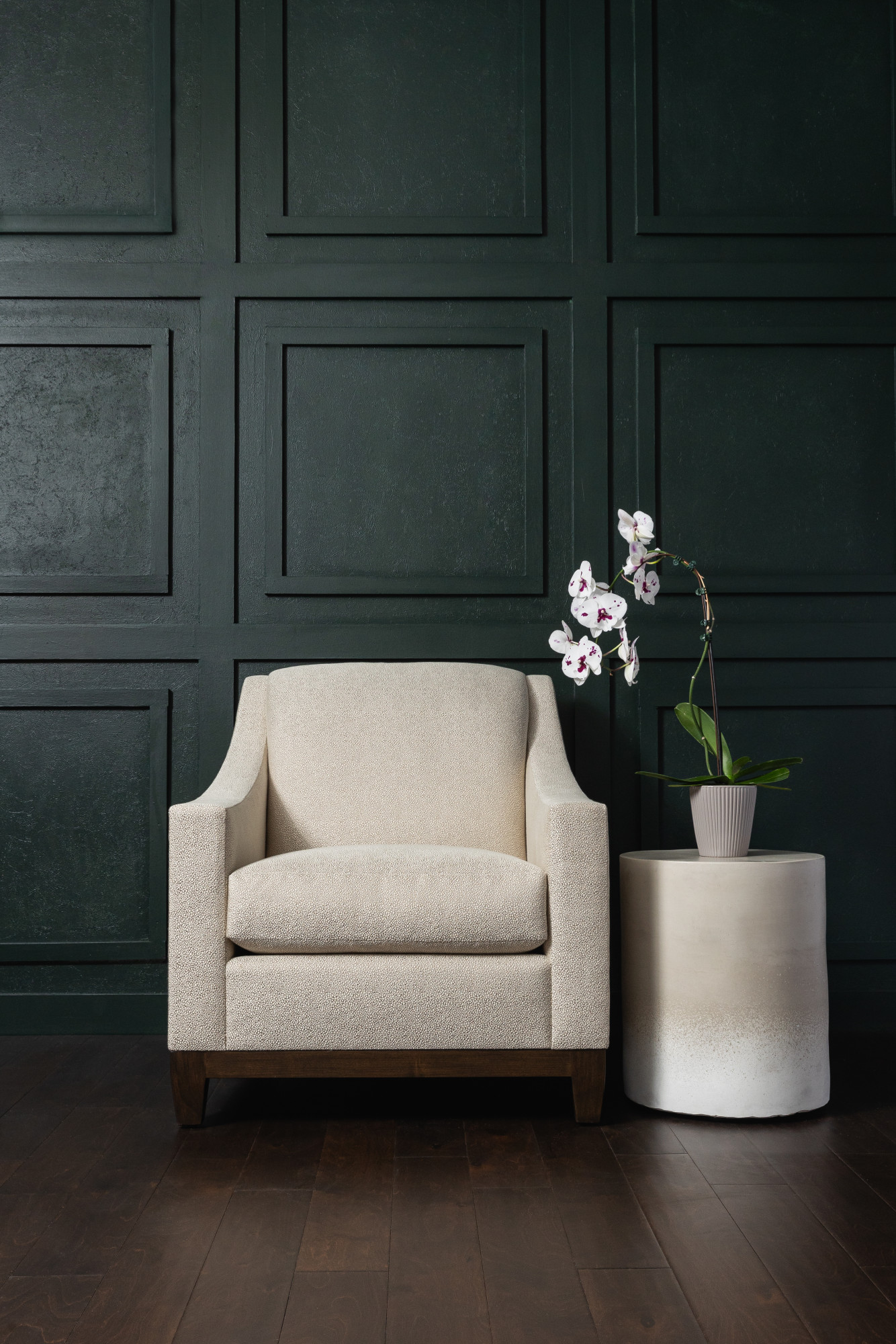 8352-10 Calathea - Kindling Wood, 3991-12 Aerial - Noir, V105-05 Central - Silver Dollar Installation Image